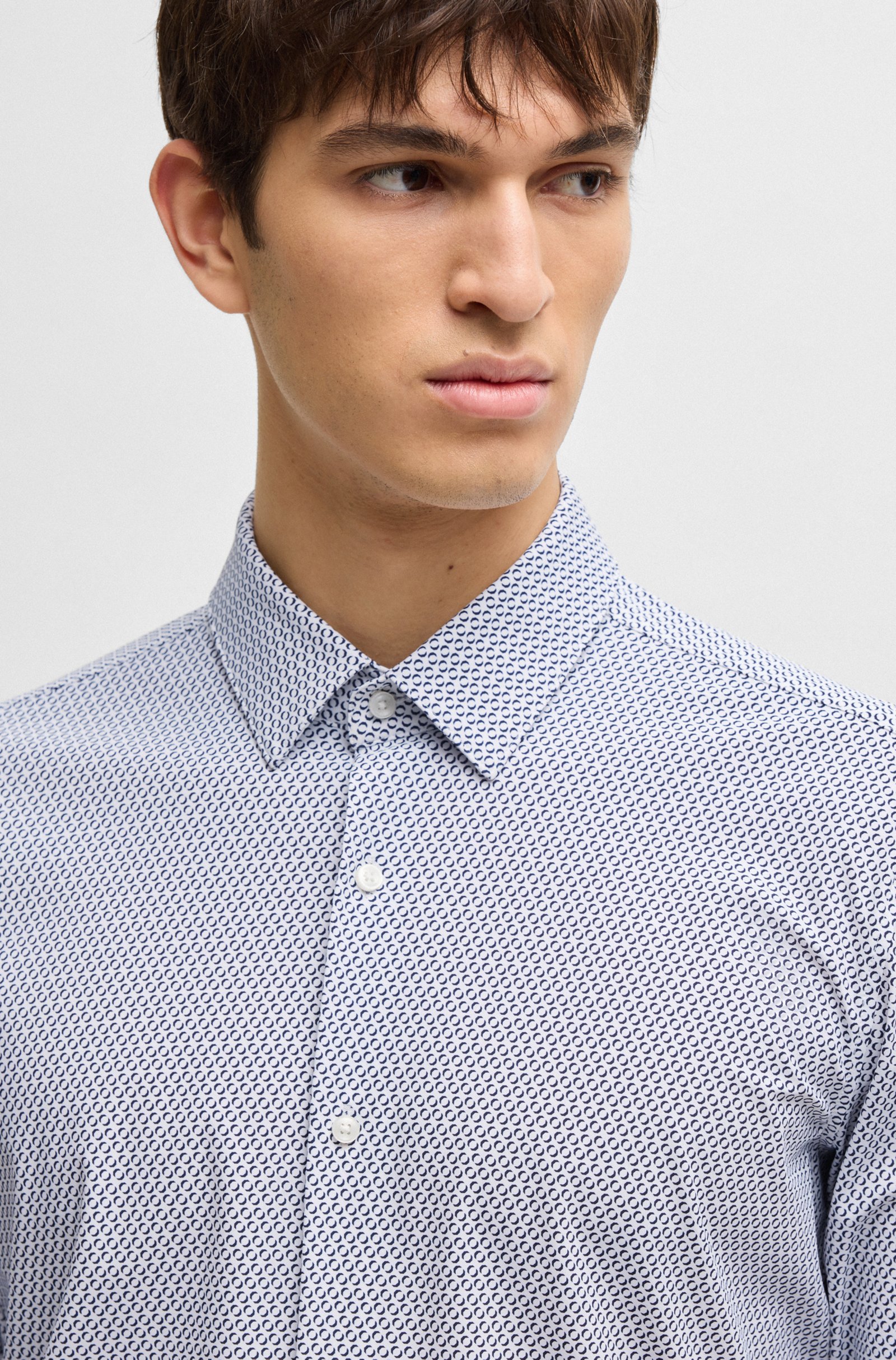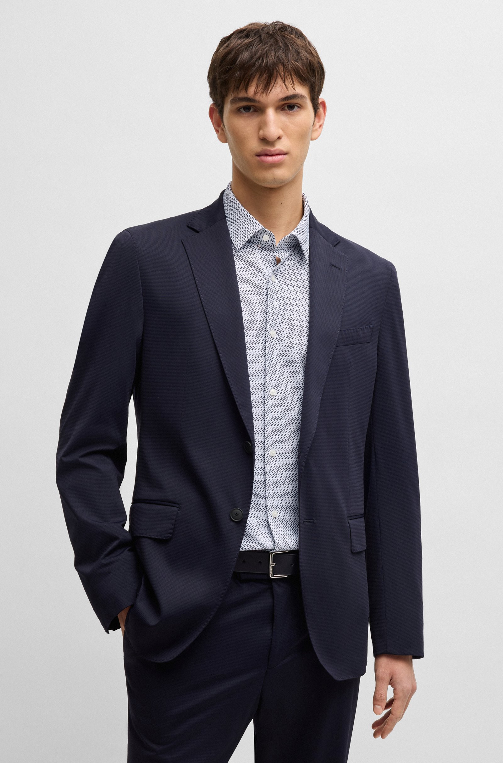Blijf comfortabel tijdens lange dagen met de geavanceerde flexibiliteit van dit overhemd van BOSS Menswear. Bedrukt met een modern motief en uitgevoerd in een gedefinieerd model.
