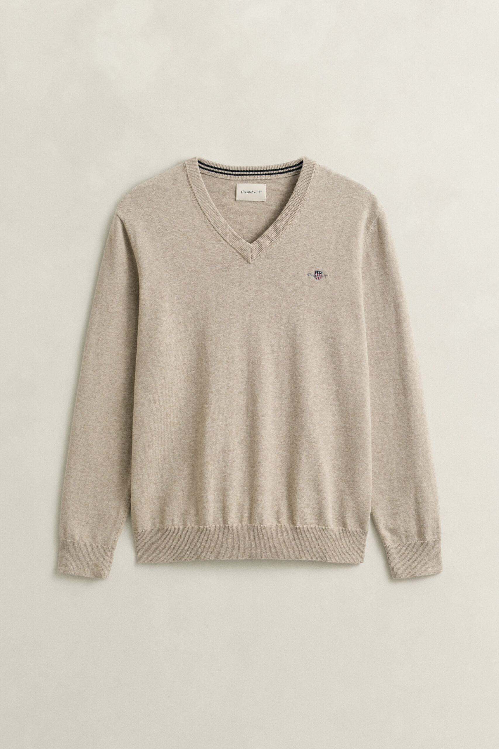 Deze katoenen sweater met V-hals heeft een normale pasvorm en een geborduurd Gant-schild op de borst.