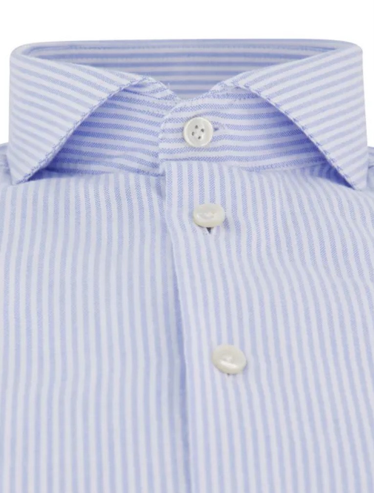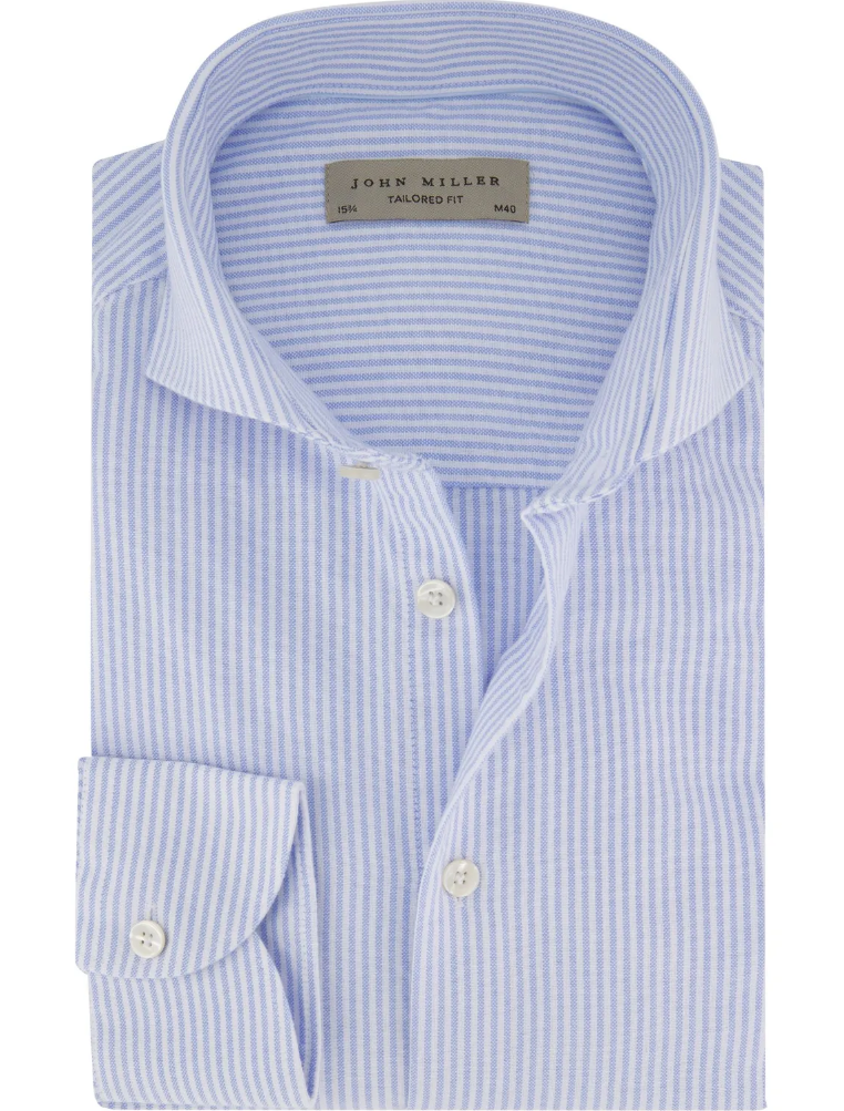 Het lichtblauwe John Miller business overhemd is een elegante optie voor de modebewuste professional. Door de normale pasvorm en de brede spreidkraag straalt dit gestreepte overhemd klasse uit. Gemaakt van 100% katoen, met lange mouwen en een enkele manchetknoop, is het uitstekend geschikt voor een nette zakelijke uitstraling.