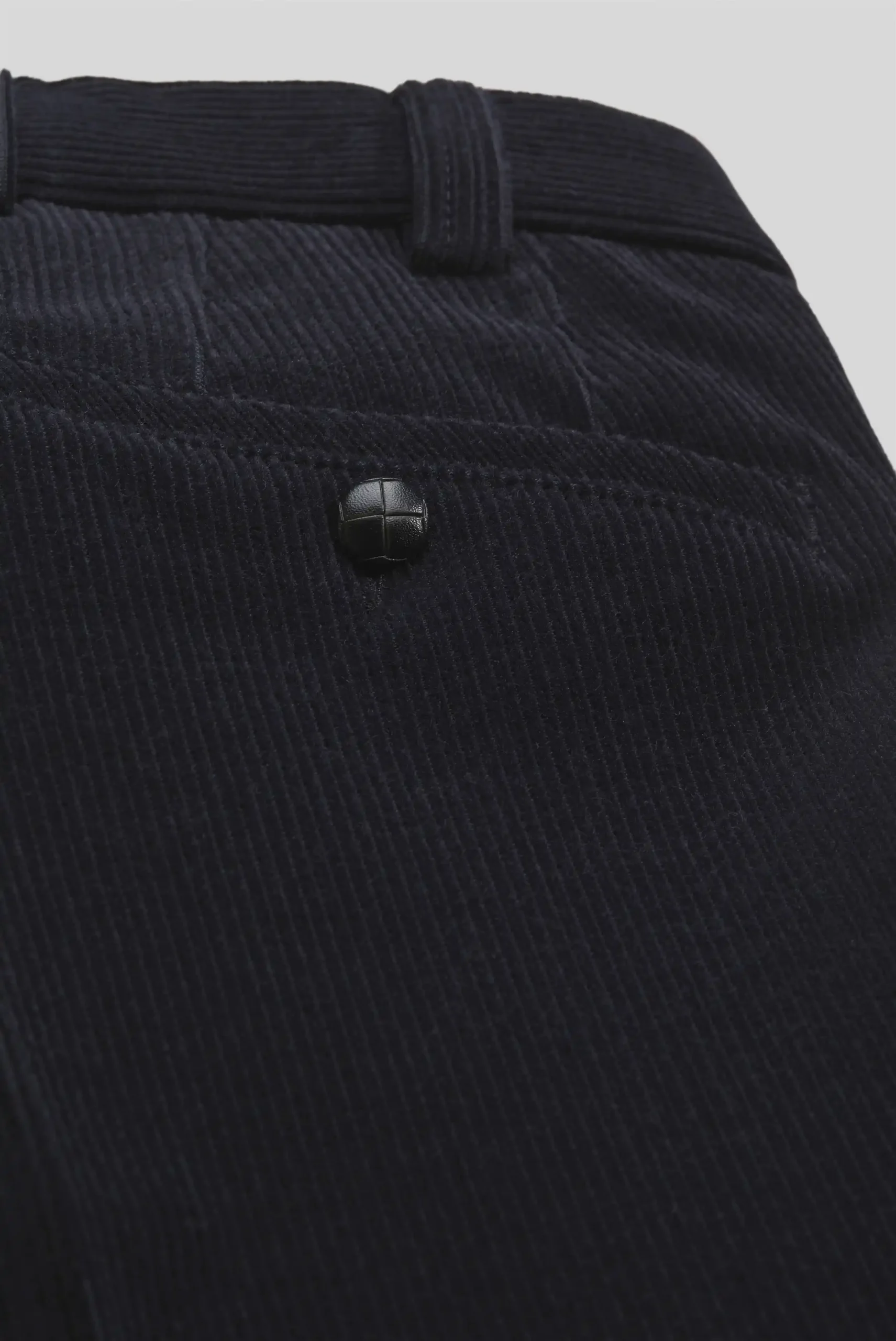 Deze elegante wolcord wollen ribstofbroek in donkerblauw verenigt de winterse look van een ribstofbroek met de hoogwaardige, kreukbestendige en sterke eigenschappen van een wollen broek. Het broekmodel Roma bezit een voortreffelijke pasvorm. De voor MEYER typische details zijn liefdevol geselecteerd. Hoogwaardige knopen, het verborgen veiligheidszakje met rits of de binnenkant van bont geweefde binnenvoering onderscheiden deze broek. Door de samenstelling van de bovenstof uit 55% polyester, 42% wol en 3% elastan, de extra voorbroekvoering en de beproefde stretch-rekband, die max. 3 cm meegeeft, ontstaat een optimaal draagcomfort. Vanzelfsprekend is deze broek ook geschikt voor de thuiswas.