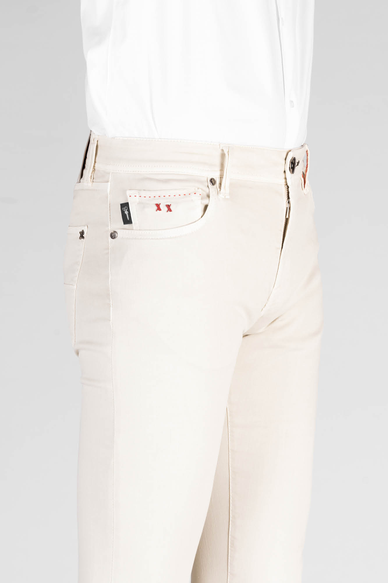 Deze stijlvolle Tramarossa jeans in een elegante ivoorkleur combineert tijdloze uitstraling met comfort en kwaliteit. Gemaakt van een hoogwaardige samenstelling van 87% katoen, 9% polyester en 4% elastan, biedt deze jeans een perfecte balans tussen ademend vermogen en een goede pasvorm. De ivoorkleur geeft een frisse, lichte uitstraling die gemakkelijk te combineren is met diverse outfits. Dankzij het elastanpercentage sluit de jeans mooi aan en biedt het voldoende flexibiliteit voor dagelijks draagcomfort. De verfijnde afwerking en het iconische design maken deze Tramarossa jeans een must-have voor wie stijl en comfort waardeert.